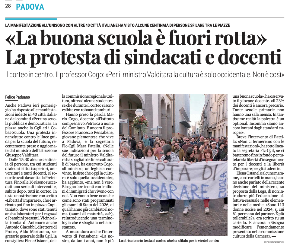 18 ottobre 2025 – Padova – Giornata di mobilitazione nazionale: Contro le nuove Indicazioni e per la difesa della Scuola Pubblica.