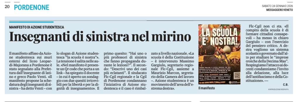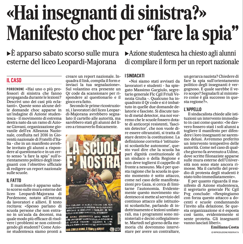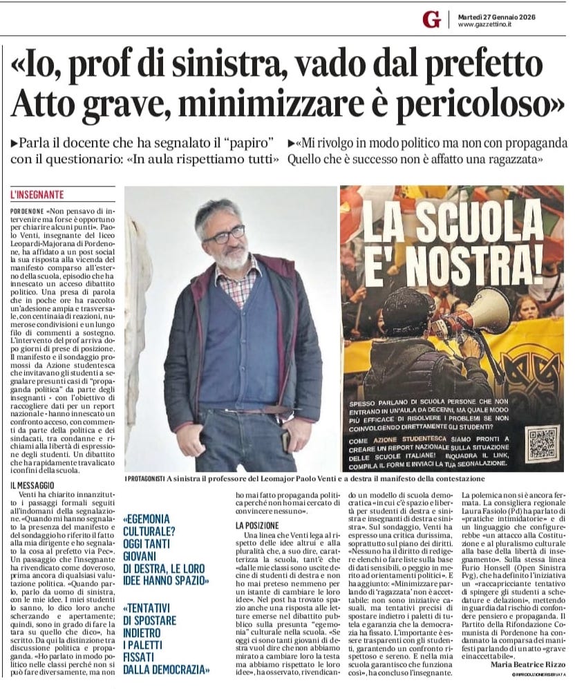 LE PAROLE DI DONZELLI non stupiscono. È proprio alla festa nazionale della fiamma tricolore, Atreju, da lui organizzata, che Azione studentesca ha presentato la campagna “La scuola è nostra”, che ha al centro il questionario sui professori che «fanno propaganda». I giovani leader di As erano sul palco nel corso del dibattito “La scuola del merito: formazione, educazione, rispetto”. A benedirli c’erano il ministro dell’Istruzione (e merito) Giuseppe Valditara, la sottosegretaria Paola Frassinetti e Gino Zavalani, direttore di Esperia, una testata ispirata a Charlie Kirk, l’estremista di destra statunitense ucciso a settembre 2025. Momento clou dell’incontro l’esposizione sul palco dello striscione della campagna. A reggerlo, al centro, c’è la sottosegretaria entusiasta. Quindi Fdi non solo sapeva ma non ha avuto nulla da ridire.