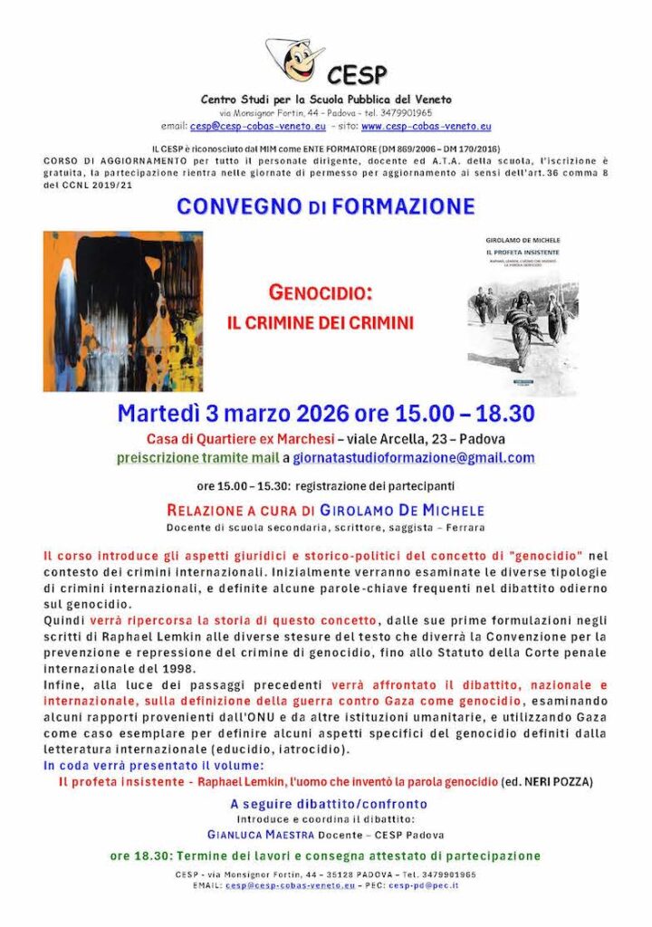 Il CESP, Centro Studi per la Scuola Pubblica di Padova, è nato nel luglio del 2004. In questi anni, oltre a promuovere dibattiti, presentazioni di libri, rassegne cinematografiche e spettacoli teatrali inerenti al mondo dell’istruzione, ha sviluppato decine di convegni sul territorio.