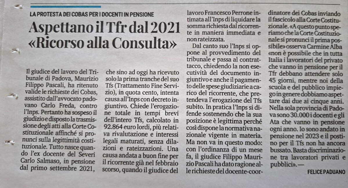 Cobas Scuola del Veneto vs INPS 2 – 0 …e palla alla Corte Costituzionale! Il Trattamento di Fine Rapporto (TFR) e il Trattamento di Fine Servizio (TFS) per i dipendenti…